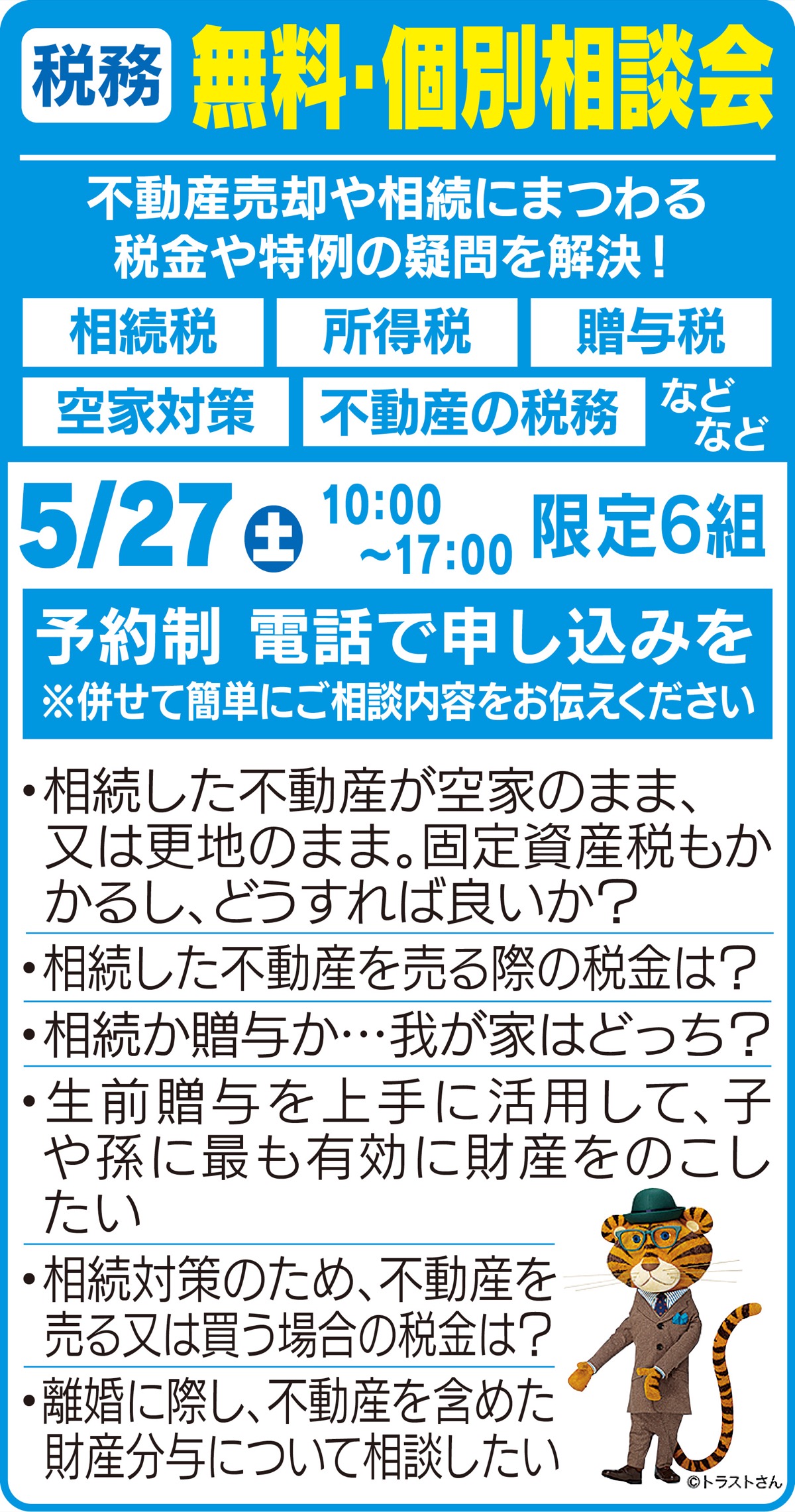 相続税や贈与税、有効活用、購入・売却・住み替えなど不動産に関するお悩みや疑問について、相続や不動産を専門とする同社の提携税理士に相談できる貴重な機会だ。「我が家に相続税はかかるの?」「不動産の売却や住み替えにまつわる税金や特例について知りたい」「相続した不動産はどうすればいい?」「節税案を知りたい」など1組60分、我が家の場合での相談が可能。限定6組で予約制(先着順受付)。申込みは下記【フリーダイヤル】で。