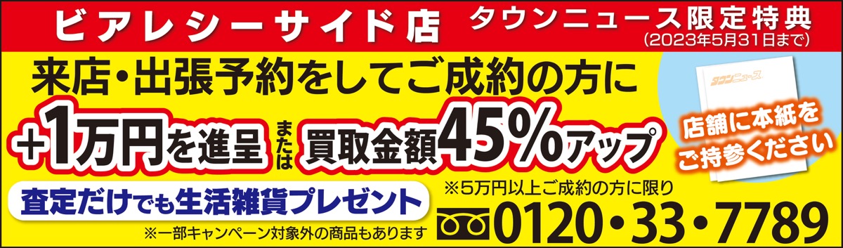 買取専門店「おたからやビアレシーサイド店」では、お得なキャンペーンを実施中。来店・出張予約をしてからの買取成約で、買取金額と別で現金1万円を進呈、または買取金額が45%アップする特典がある。スタッフは「5月も残り数日となりました。ぜひこの機会に、来店・出張問わずご利用ください」と話す。