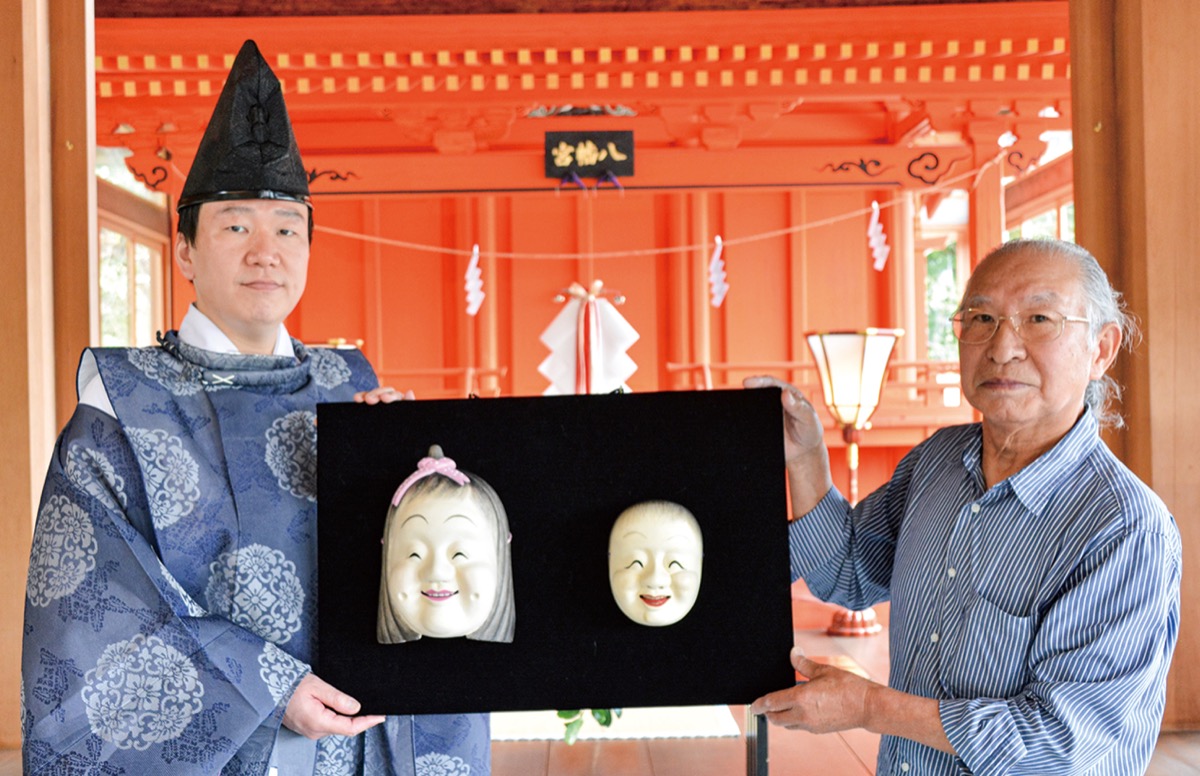 寄贈当日は坂路禎己権禰宜が佐藤さんから面を受け取り、奉納報告の式典が執り行われた。佐藤さんは「祝詞まであげてもらえてうれしい。私自身、娘のお宮参りに来たのはこの八幡様。多くの人に見ていていただき、地元の発展につながれば」と話す。