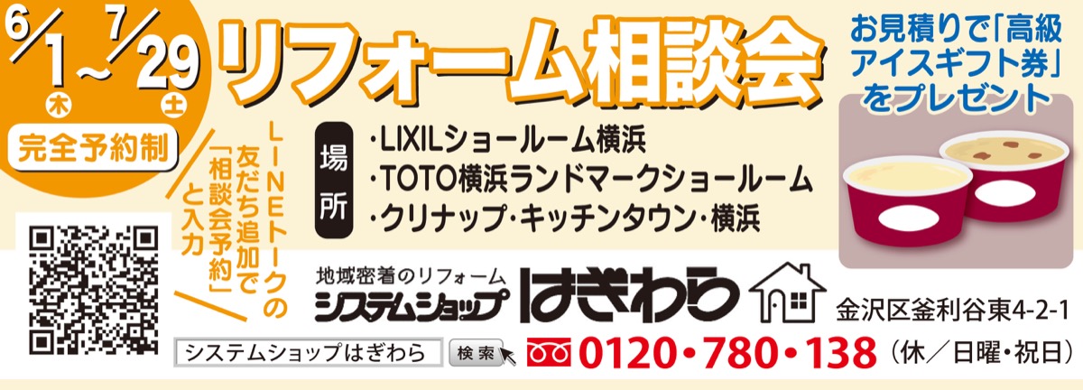 住む人の心と体に優しい家づくりの「システムショップはぎわら」(金沢区釜利谷東)は7月29日(土)まで「夏のメーカーショールーム相談会」を開催中。同店スタッフの案内で、みなとみらいのLIXIL、TOTO、クリナップのショールームから好きな場所を見学できる(完全予約制)。