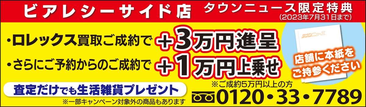買取専門店「おたからやビアレシーサイド店」は、腕時計・ロレックスの買取を強化している。7月末までは買取金額と別に、現金3万円を進呈。スタッフは「査定だけでも大歓迎です。ガラスが割れてしまった、動かなくなってしまった時計でもお受けいたします」と話す。