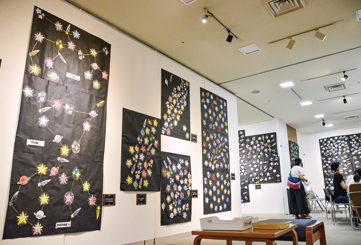 5月末から約1カ月にわたり、各施設や地区内の協力店舗などで「夜空のカケラ」と名付けた塗り絵を配布すると、約3000枚が集まった。集まった塗り絵をもとに、実行委員が中心となって星座やさまざまな形をかたどった大きな作品を制作。約90枚の模造紙に完成した作品が、杉田劇場ギャラリーにずらりと並んだ。実行委員の一人は「1枚1枚の良さを生かすことができるように、図案や色のバランスを見ながら工夫して貼り付けた。皆で協力して良い作品を完成させることができた」と話した。