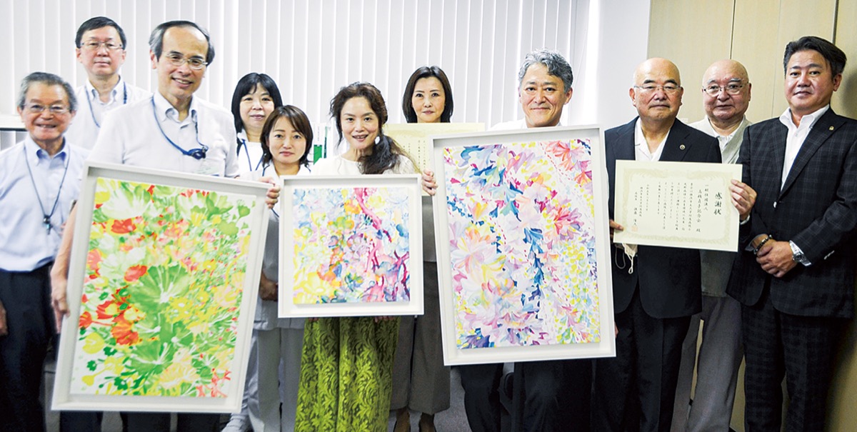 贈呈式には同クラブのメンバーら約10人が出席。曽谷さんが「コロナ禍で町に人の手が入らなくなった空き地に生えていた雑草の美しさ」などを描いた3点が寄贈された。後藤隆久病院長は「華やかで心が明るくなる絵画をいただきありがたくうれしい。患者さんや家族だけでなく、職員もこの絵画に力づけられると思う」。古田会長は「入院している本人、付き添う親御さん、兄弟が抱えている苦労はなくならないと思うが、辛い治療を乗り越えて幸せになってほしい、応援しているよというメッセージになれば」と話した。
