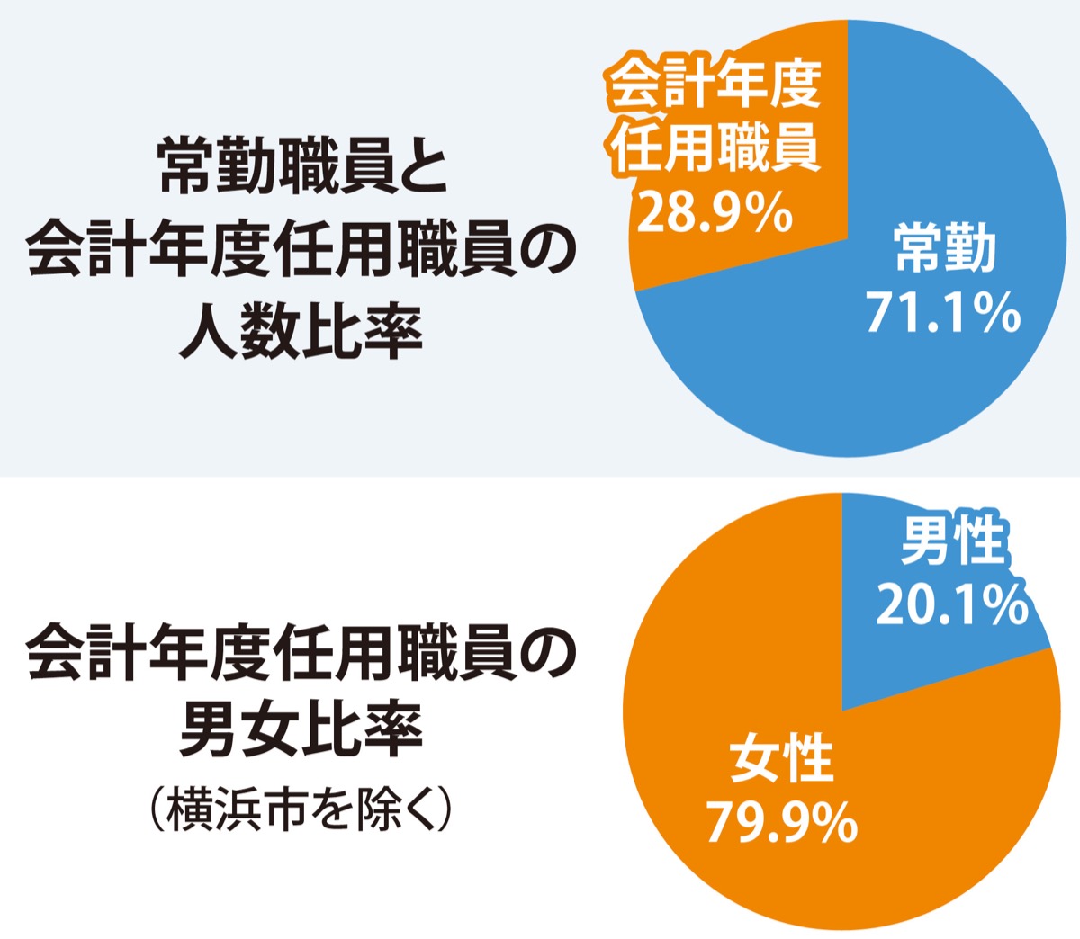 男女比率(集計が無い横浜市を除く)は、常勤職員が男性58・7%、女性41・3%で、非正規職員は女性割合が79・9%に上ることがわかった。