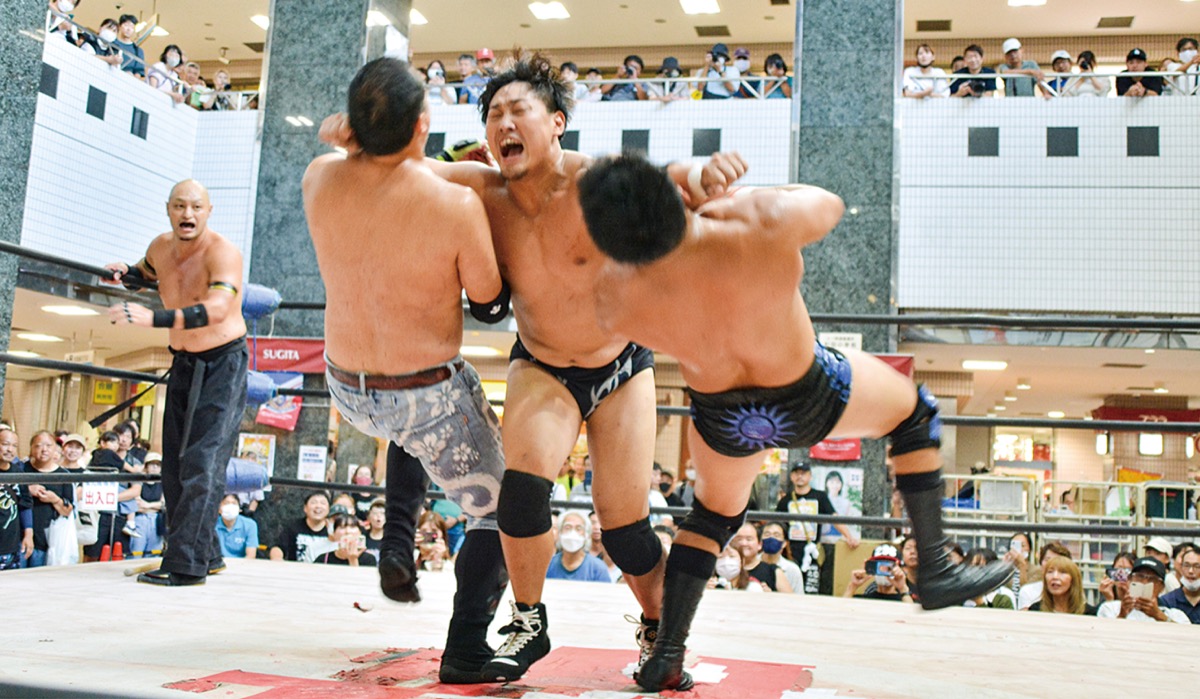 都筑区に拠点を置く大日本プロレスと、横浜市商店街総連合会がタッグを組み、毎年市内各地の商店街で行われているもの。今年は7月からスタートし、今回が第4戦。1階パティオ広場に設置されたリングで4試合が行われたほか、選手が指導する子ども向けのプロレス教室や商店街加盟店のPRも実施した。試合ではリング外の観客席間や2階で場外乱闘が繰り広げられる場面もあり、会場は盛り上がった。同会の佐藤祐治会長は「多くの人に来ていただけてありがたい」と話した。