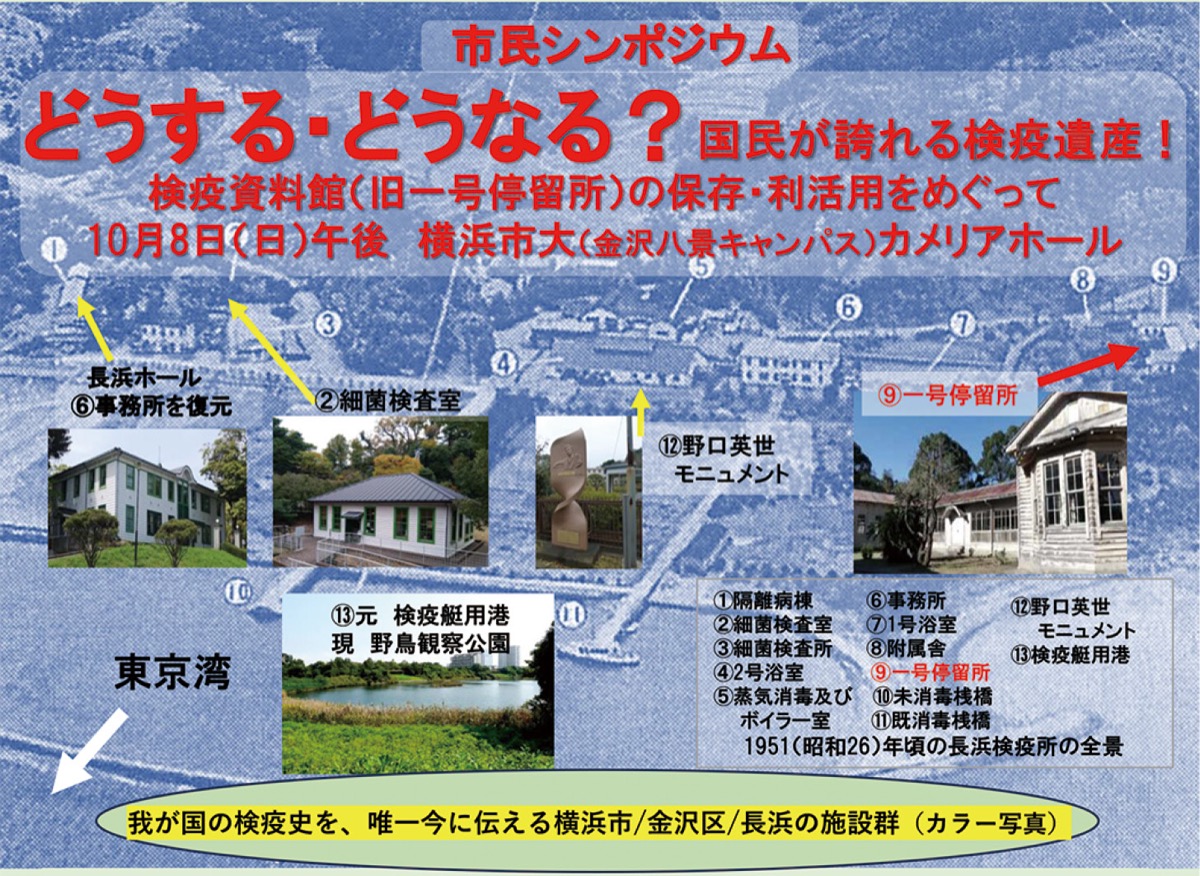 NPO法人野口英世よこはま顕彰会(田中常義理事長)は10月8日(日)、国登録有形文化財「旧長濱検疫所一号停留所(厚生労働省横浜検疫所検疫資料館)」の保存・利活用の現状と今後を考える市民シンポジウムを横浜市立大学金沢八景キャンパスカメリアホールで開催する。午後1時30分から4時30分。定員300人。はがきかHP「野口英世よこはま顕彰会」から要事前申し込み。