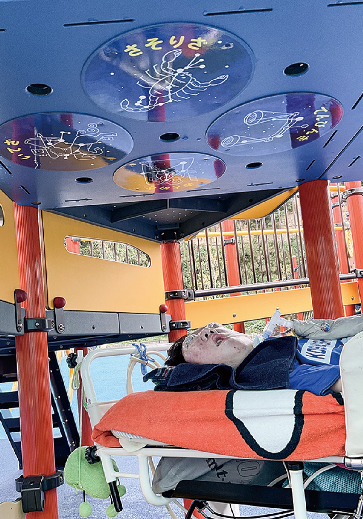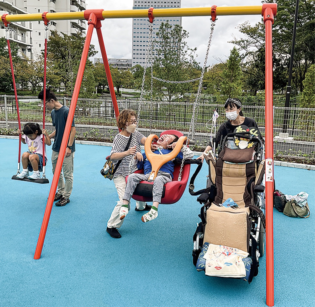 開園式後は、式に参加した子どもたちが遊具広場を体験。戸塚区の東俣野特別支援学校「呼吸器生活向上委員会」の鈴木妙佳子代表は、「寝たきりの子は公園に行っても空しか見えなかったのが、この子たち目線で楽しめる公園ができて本当に感激している」。同校中学3年の金野太晴さん(14)はブランコを体験。父の幸雄さんは「こんなに楽しそうな顔を見たのは初めて。他の子どもたちが遊んでいる中で、楽しめてよかった」と話していた。