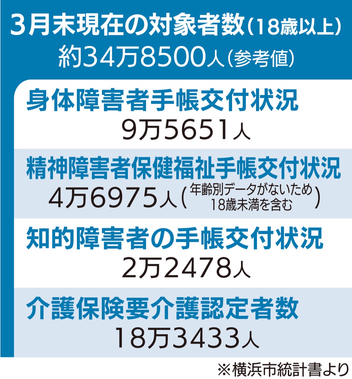 対象は身体・精神・知的の各手帳が交付されている18歳以上および、要介護認定を受けている全ての人。今年3月末現在で、おおよそ34万8500人(精神の手帳交付は年齢別情報がなく18歳未満を含む)になる。
