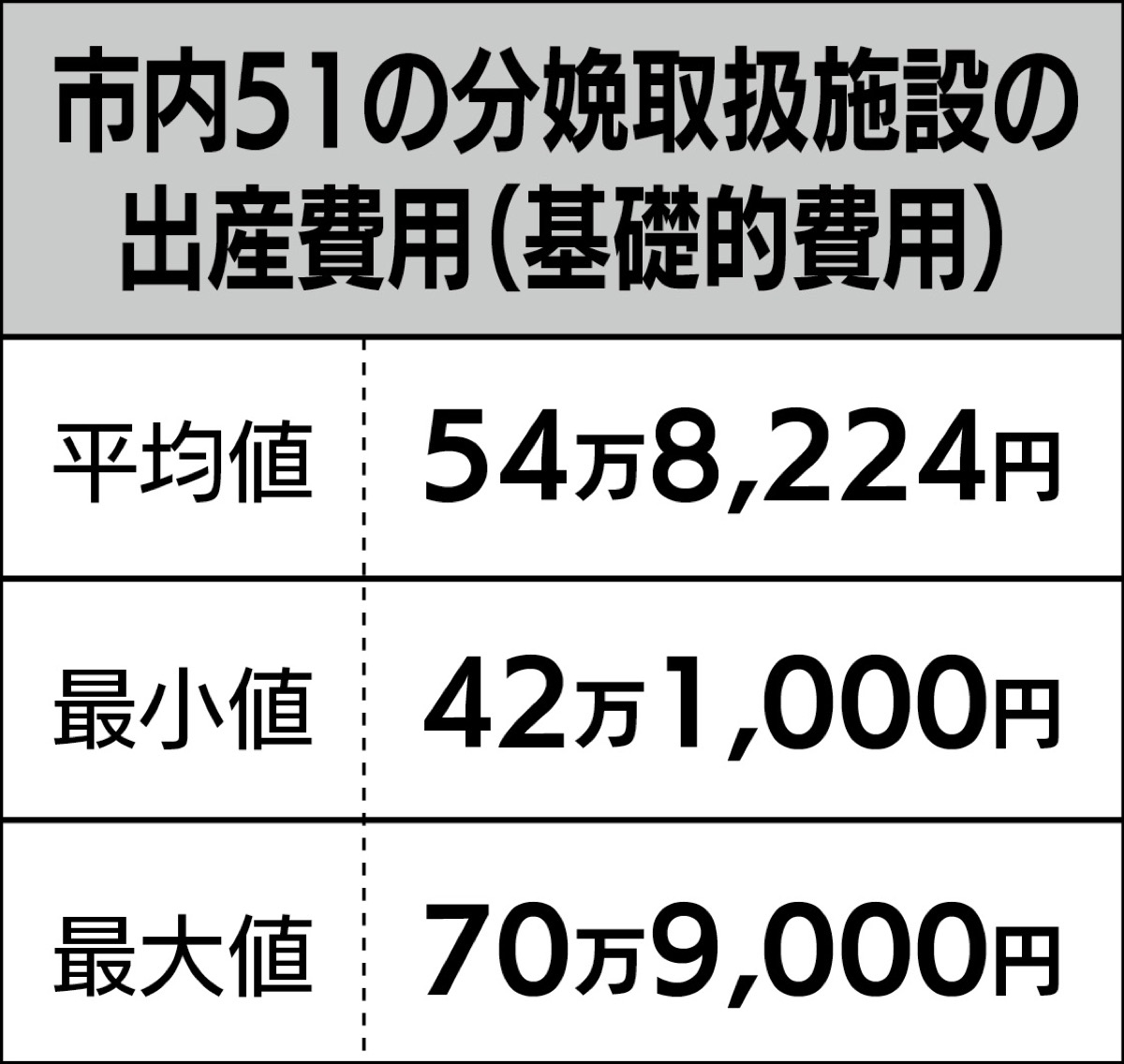51施設の平均額は54万8224円となり、国が今年4月に42万円から50万円に引き上げた出産育児一時金では賄いきれていない現状が明らかになった。また、最も安価な施設が42万1000円だったのに対して最も高額な施設は70万9000円と、費用に大きな差があることも分かった。これに対して市の担当者は「県内でも都市部という点や各施設での分娩に対する考え方、経営費用の差なのではないか」と推測した。一方で、11の公的病院に限定すると約46万円から約58万円と費用の幅が小さかった。