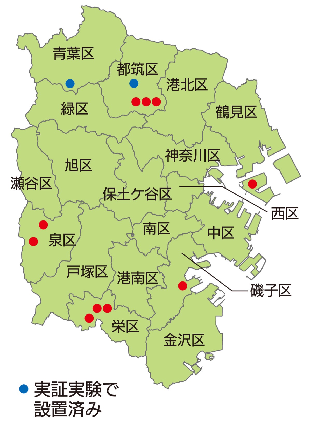 設置候補地は、鶴見区(大黒ふ頭中央公園前)、磯子区(杉田)、都筑区(勝田南に2カ所、仲町台)、栄区(柏陽高校校門側、同グラウンド側、大船駅笠間口)、泉区(和泉川沿い、泉図書館前)の10地点。充電器を置いても安全な場所や、充電中立ち寄れる場所がある利便性などを考慮し、設置可能な場所として選ばれた。