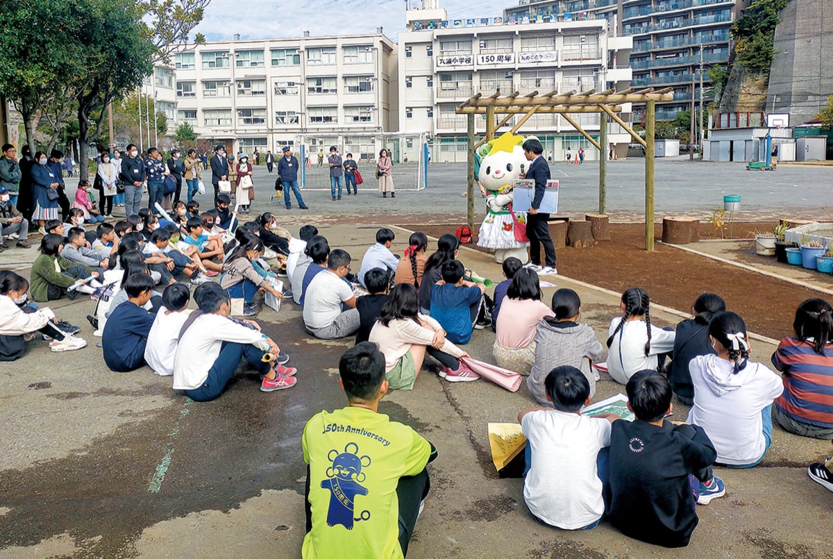 金沢区の六浦小学校(尾上伸一校長)は11月23日、公開授業を実施した。保護者や地域関係者に加え、岩手県陸前高田市の職員と同市のマスコットキャラクター「たかたのゆめちゃん」も同校を訪れ、児童たちと交流した。