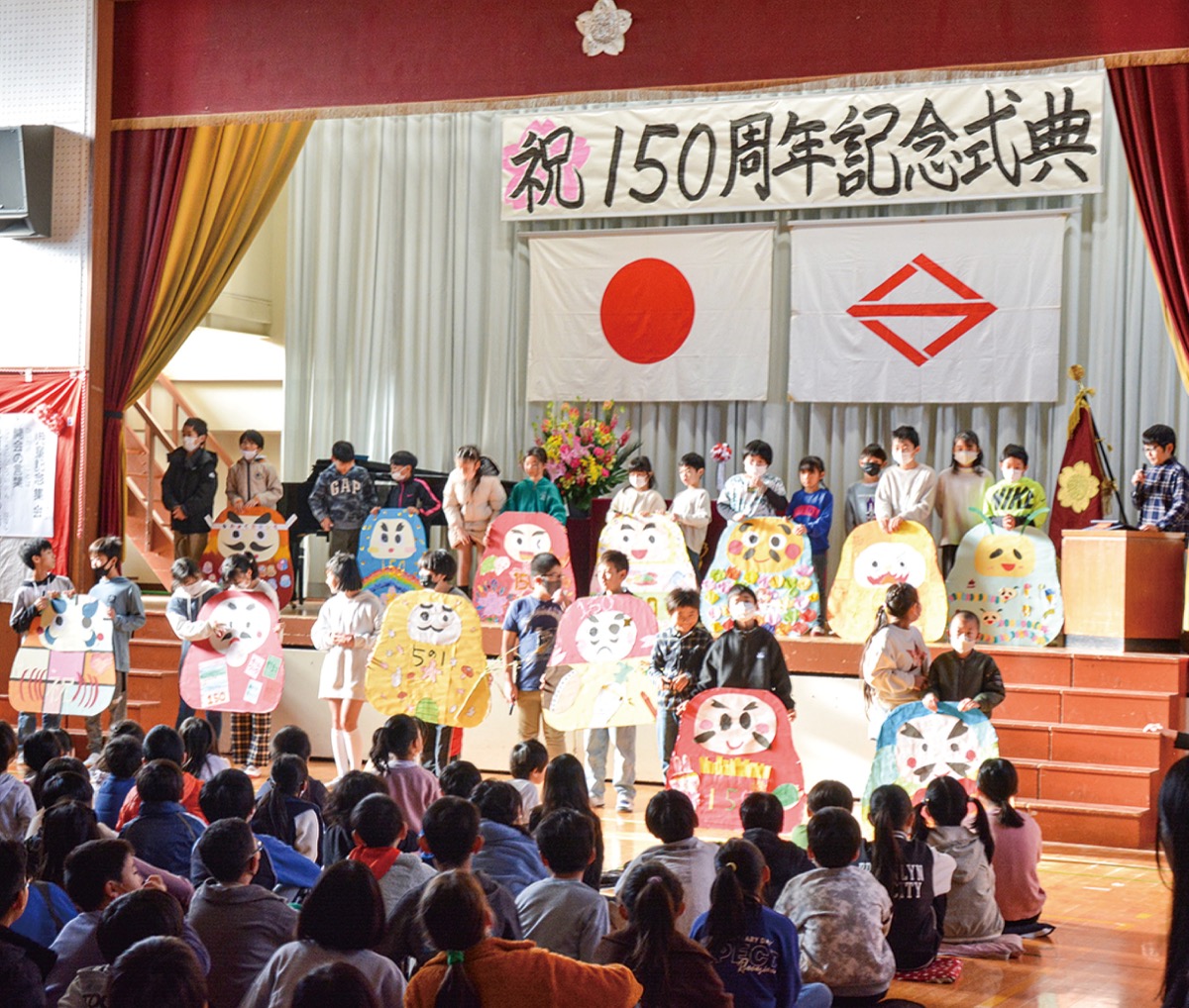 児童向けの記念式典と集会に分かれた催しには、児童や記念事業実行委員、教職員ら約400人が参加した。式典では実行委員会から児童へ記念品が贈られたほか、各クラスがクラス目標などをイメージして作った13体のだるまが登場。その場で代表の児童たちが目入れし、節目を祝った。