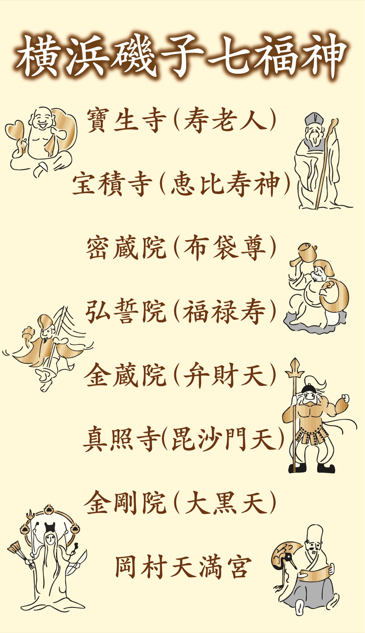 現在は寶生寺(寿老人)、宝積寺(恵比寿神)、密蔵院(布袋尊)、弘誓院(福禄寿)、金蔵院(弁財天)、真照寺(毘沙門天)、金剛院(大黒天)に、岡村天満宮を加えた8カ所となっている。今年は1月7日(日)に開催(詳細左記)。荒天中止。5つのコースが設けられ、順番に8カ所を巡ることができる。