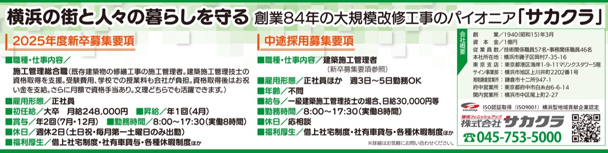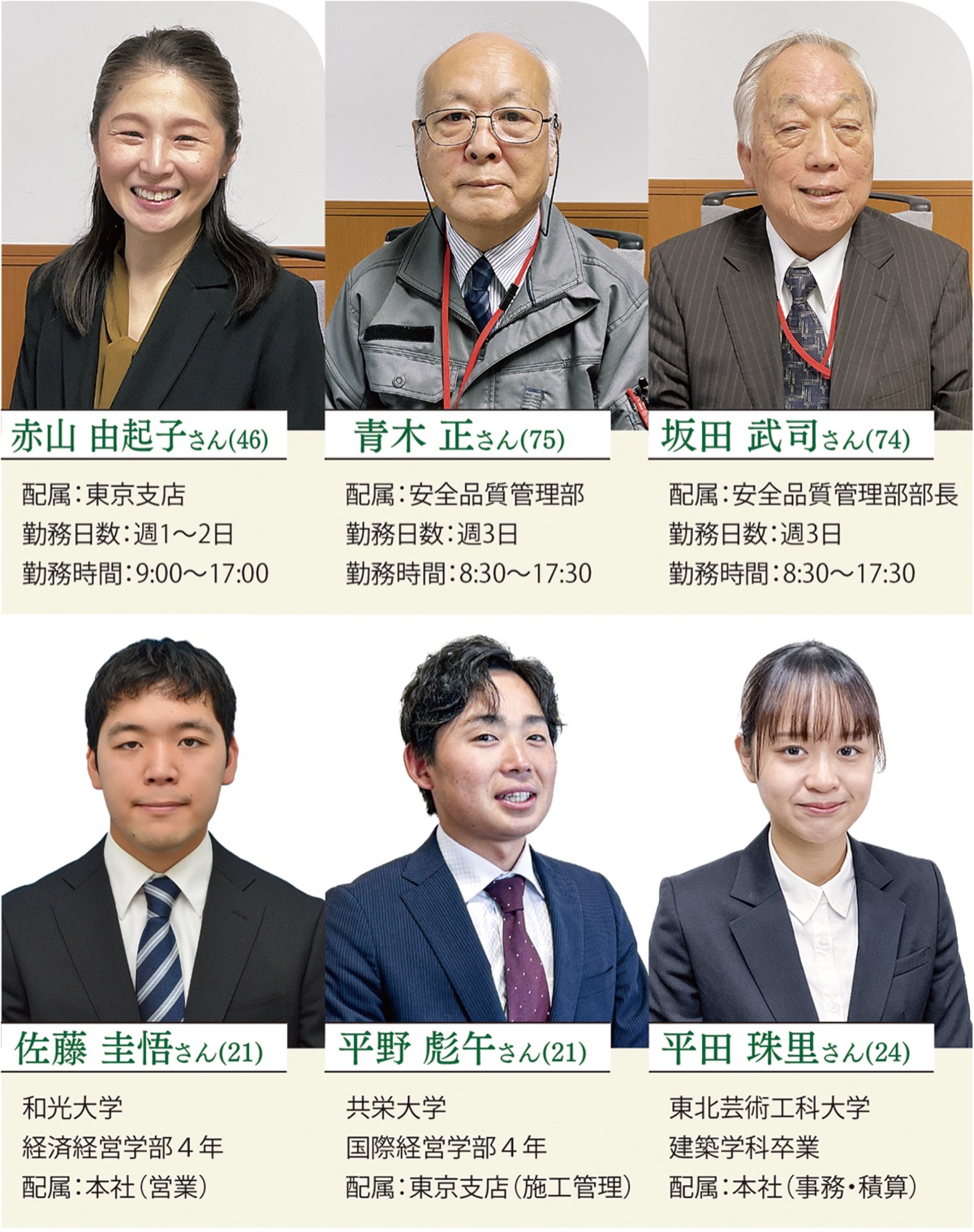 昭和15(1940)年創業、マンション大規模改修工事のパイオニアとして知られる(株)サカクラ=磯子区岡村=。同社には現在103人の従業員がいるが、正社員だけでなく、定年退職後のシニア、女優との兼業など、「多様性ある人材」「柔軟な働き方」を積極的に受け入れている。同社の坂倉賢副社長は、「働き方改革には多種多様な人材が必要。様々な人の人生や価値観を受け入れることが会社としての成長につながる」と話す。今回は昨年、今年入社の6人に話を聞いた。