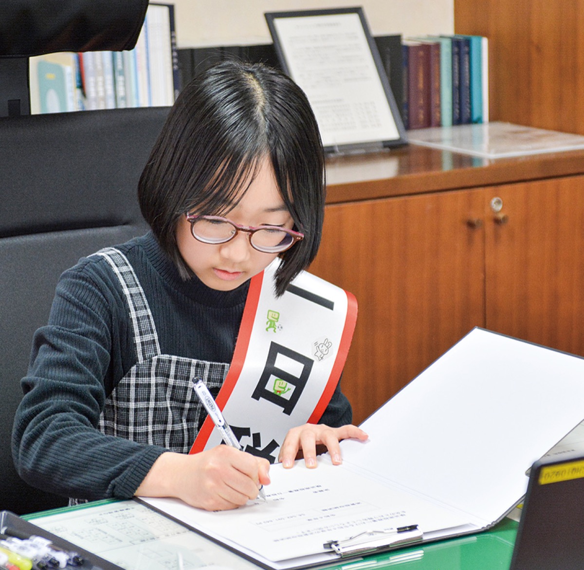 一日署長を務めたのは「税の作文」で全国納税貯蓄組合連合会優秀賞を受賞した井川優さん(港南区・港南台第一中3年)と横浜南税務署長賞を受賞した大西はなさん(同3年)、「税に関する絵はがきコンクール」で横浜南税務署長賞の阿部花音さん(南区・石川小6年)、「税の標語」で横浜南税務署長賞の井土井望実さん(磯子区・屏風浦小6年)。4人は同署の井上俊生署長から委嘱を受けると、名刺交換や署長室での書類決裁などを体験した。また、4人は署長訓示として職員を前にそれぞれの作品を披露。作品を通じて感じた税の大切さを語った。