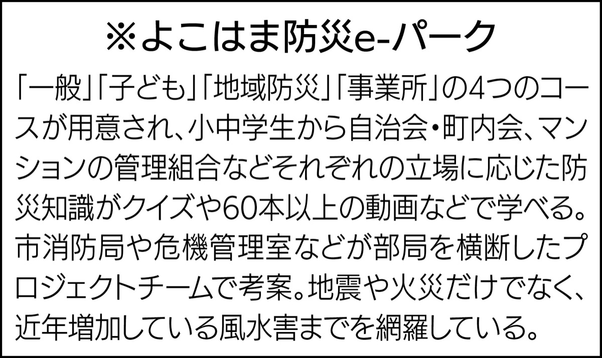 北陸地方に甚大な被害をもたらしている能登半島地震は、改めて自然災害に対する事前の備えの必要性を認識させられた。横浜市が災害の「予防分野の取り組み」として、昨年開設したのが、オンラインサイト「よこはま防災e-パーク」(※)。気軽に防災を学べる仕組みとして、注目が集まっている。