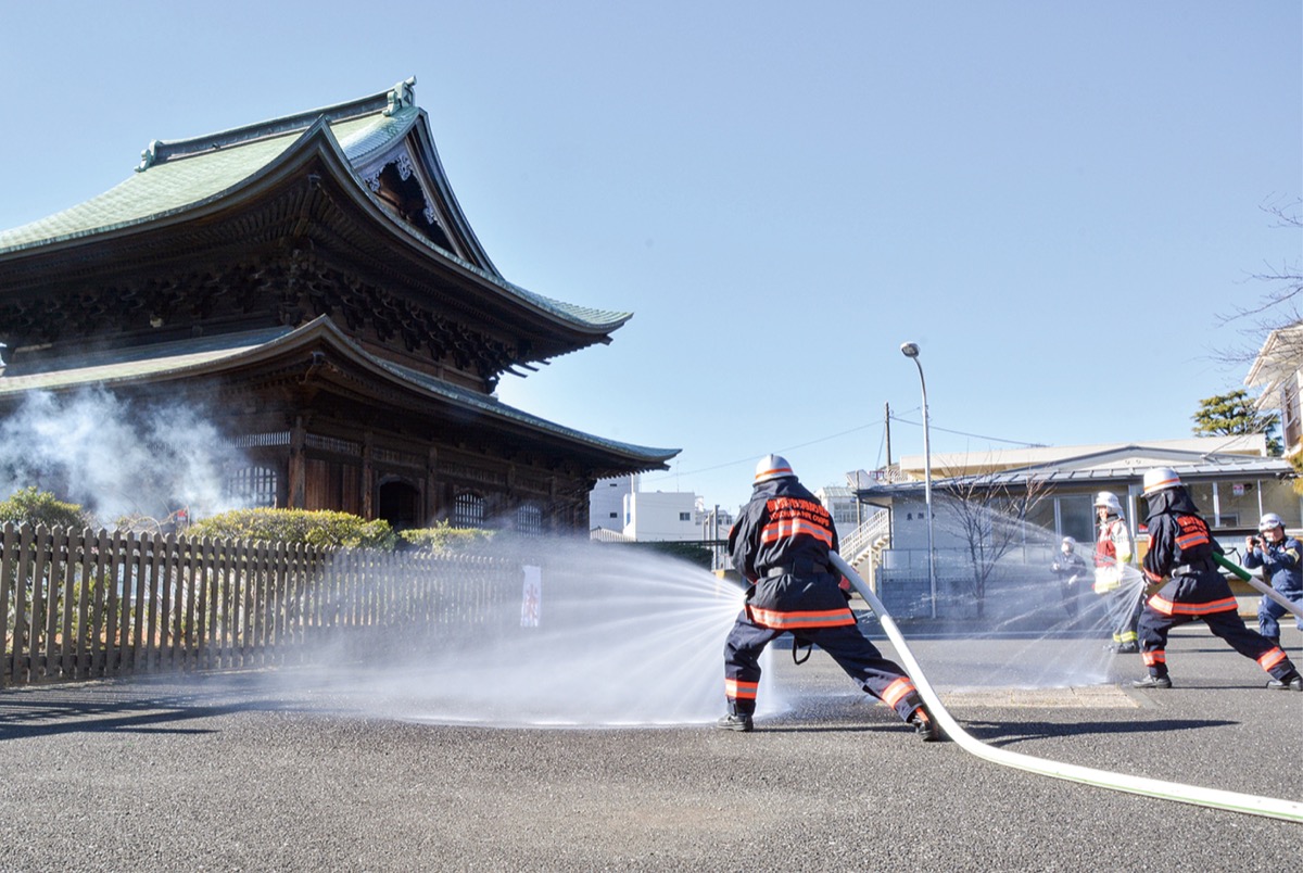 「文化財防火デー」の1月26日、磯子消防署や磯子消防団が東漸寺=磯子区杉田=で防災訓練を実施した。