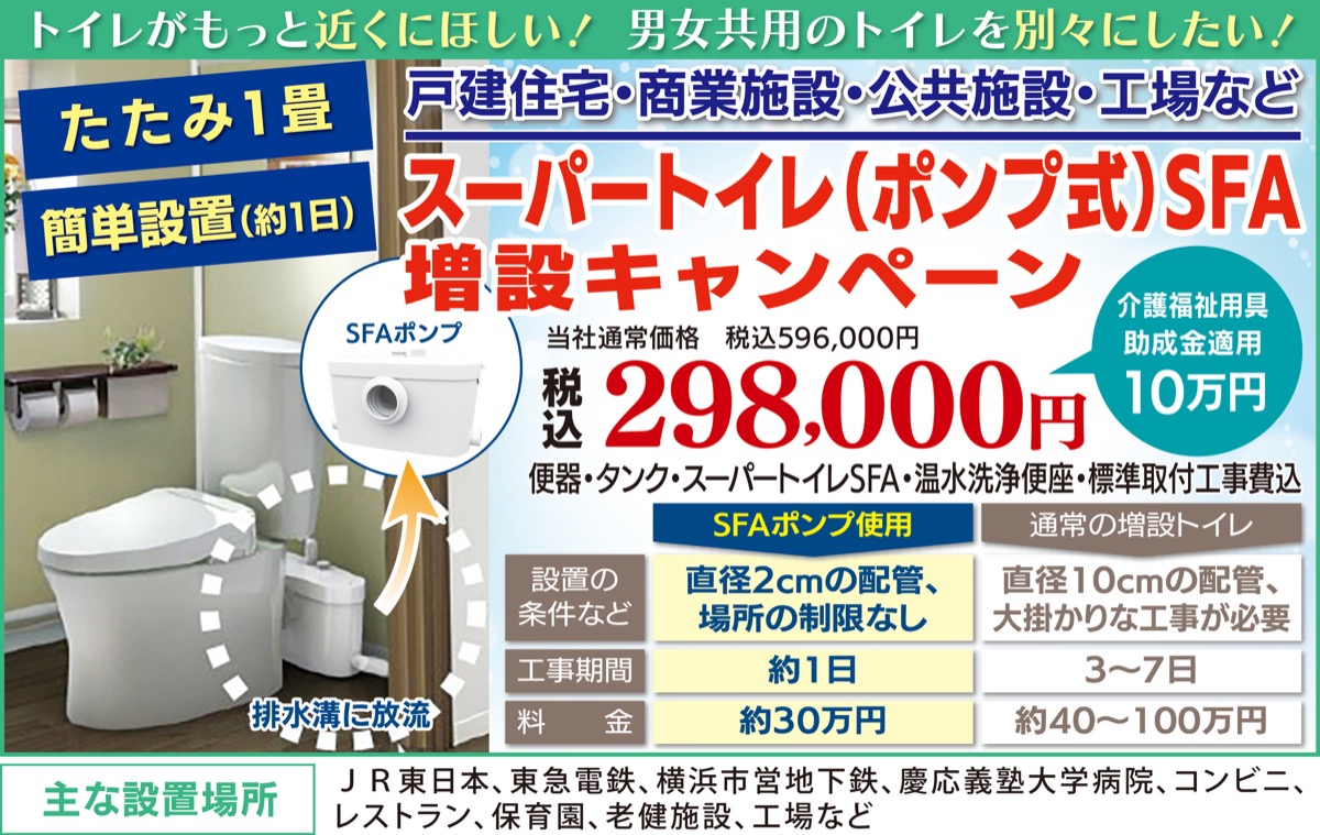 同社では現在、「創業35周年大感謝祭キャンペーン」を実施中。先着20セット限定で、節電・節水約70%のTOTOウォシュレット付便器・タンク・スーパートイレSFA・標準取付工事費込みで29万8000円(税込・同社通常価格59万6000円)で設置できる。さらに、介護福祉用具の助成金申請で約10万円相当の払い戻しも(詳細は問い合わせ)。