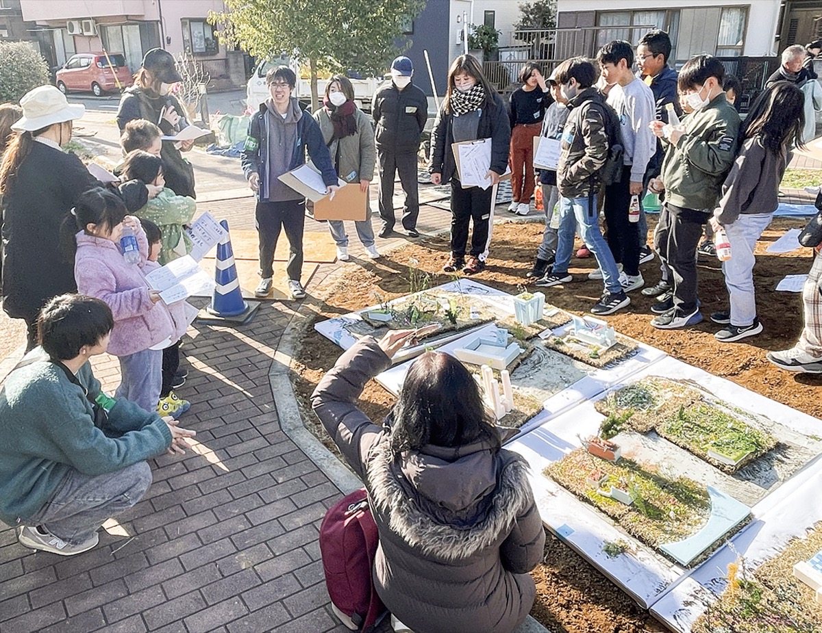 2月3日の最終回では、瀬ケ崎小や六浦中から参加した約50人の子どもたちが約30平方センチメートルの芝生を一人一枚、広場の丘に植える作業を実施。植える前には、芝生の上に人形や模型を並べ、空間づくりも体験。中津准教授は「子どもたちが大人と同等の立場で公共空間の問題点を考え、解決策をデザインした。多世代の協働作業を通し、世代を超えた信頼関係を築けた」と話す。