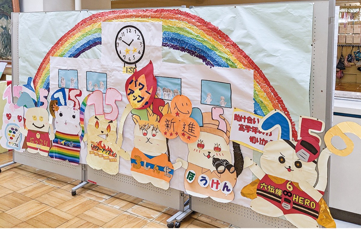 「お祝いの会」や記念式典には、各学年や個別支援学級による手作りの「いちごミルク」7体が登場。それぞれの思いをもとにした衣装などをまとった姿で、校内の昇降口近くに飾られている。