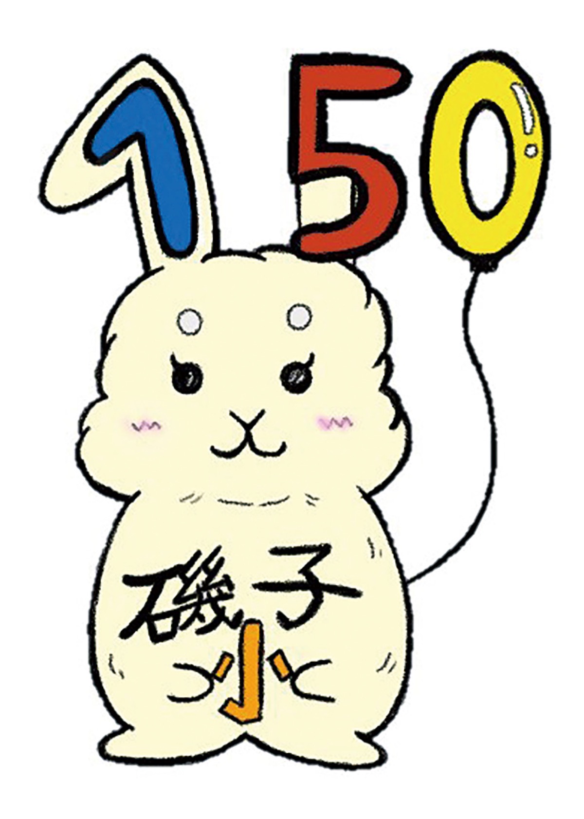 デザインを考えた橘高わかなさん(6年)によると、「未来に向かって『すすむ』『とぶ』ということを意識した」とのこと。過去に学校で飼育していたウサギの「ミルク」にちなみ、ウサギのキャラクターで、耳の部分で150周年が感じられるようなデザインになったという。
