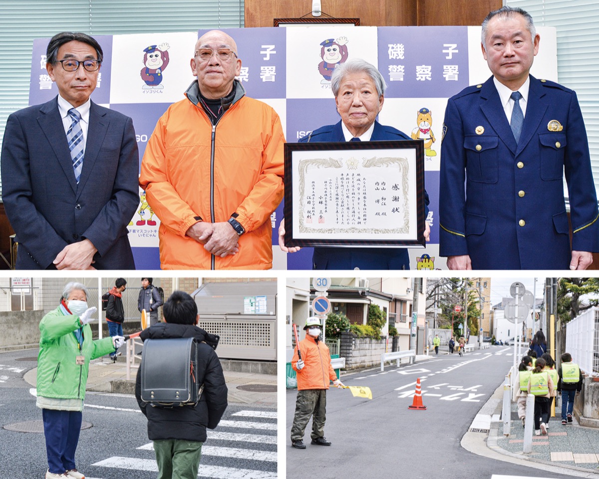 磯子区内で朝の通学時間帯に見守り活動を行う内山博さん(76)・初江さん(74)夫妻=久木町在住=に3月5日、磯子警察署と磯子小学校の連名で感謝状が贈られた。2人は10年以上にわたり、ボランティアで地域の安全に貢献。同署の小林三季署長は「地域の守り手として、交通安全に大きく貢献していただいている」と称えた。