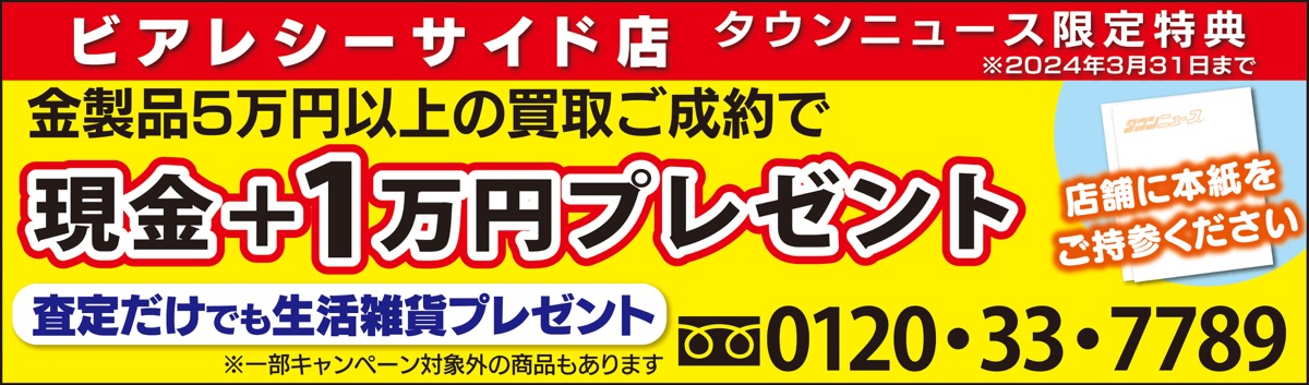 金沢区並木の商業施設「ビアレヨコハマ」本館1階にある買取専門店「おたからやビアレシーサイド店」では、3月末まで金製品の買取を強化している。買取成約金額が5万円を超えた場合、買取金額に上乗せして現金1万円をプレゼント。スタッフは「まだまだ金の高値が続いています。自宅に金製品があれば、査定だけでもしてみませんか」と話す。