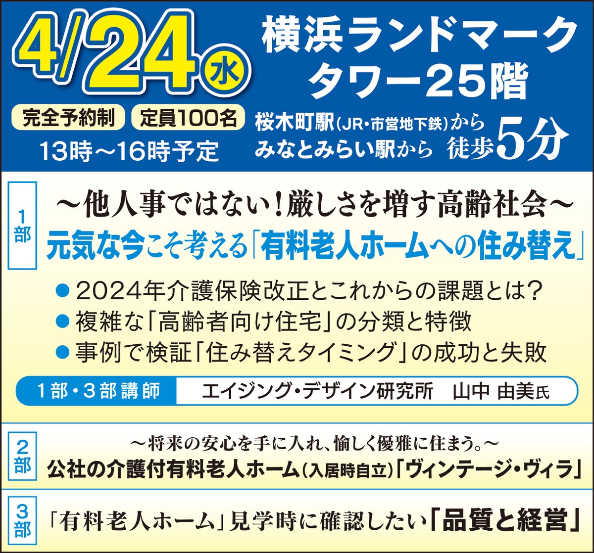 そこで今回のセミナーでは、2024年に改正となる介護保険の最新情報、複雑化する高齢者向け住宅の分類と特徴を解説。「住み替えタイミング」の成功と失敗の実例も紹介する。