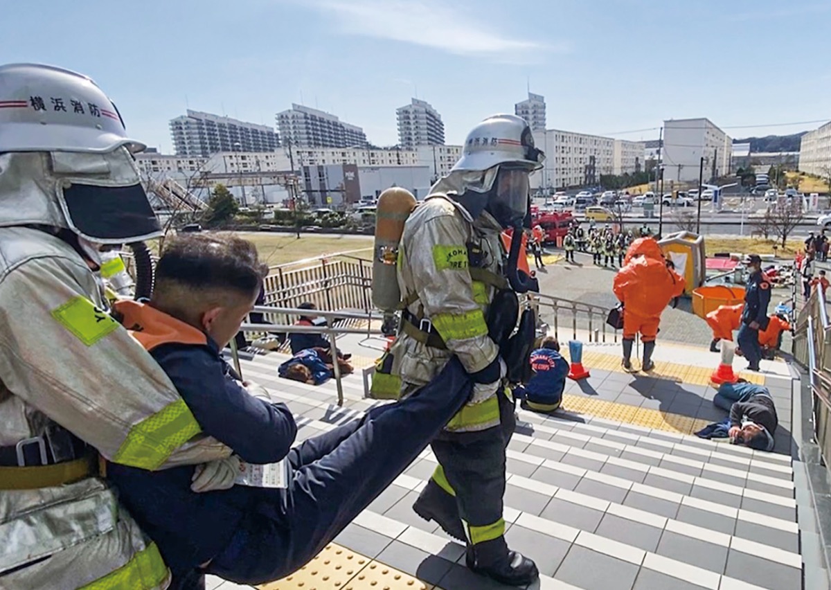 金沢公会堂で3月11日、金沢消防署、金沢消防団、金沢区役所によるテロ災害を想定した合同訓練が行われた。