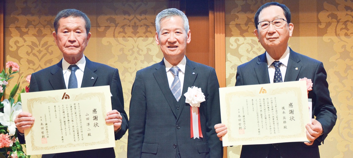 式典・祝賀会には会員や来賓約160人が出席。横浜南税務署の井上俊生署長らがあいさつに立ったほか、会員向けに新たに作られた同会公式LINEの情報が披露された。また、公益社団化に貢献した第9代会長の榎本英雄さん、第10代会長の山田淳二さんの2人に対して、感謝状が贈呈された。