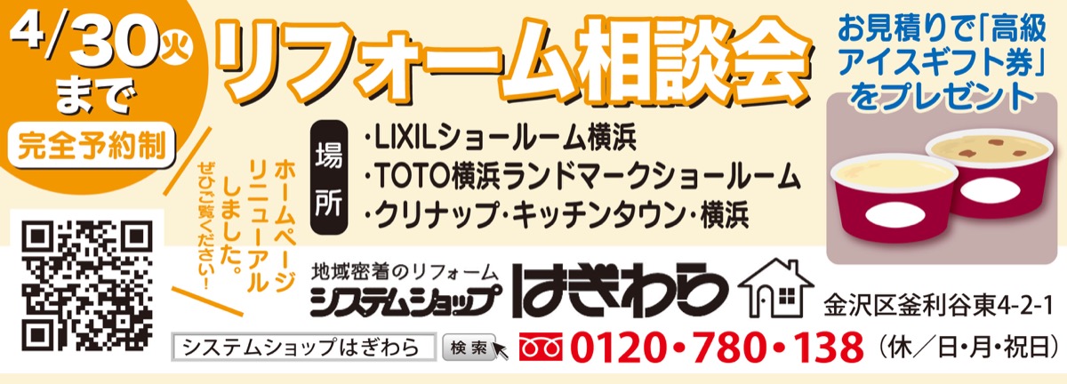 住む人の心と体に優しい家づくりの「システムショップはぎわら」(金沢区釜利谷東)は4月30日(火)まで「春のリフォーム相談会」を開催中。同店スタッフの案内で、みなとみらいのLIXIL、TOTO、クリナップのショールームから好きな場所を見学できる(完全予約制)。