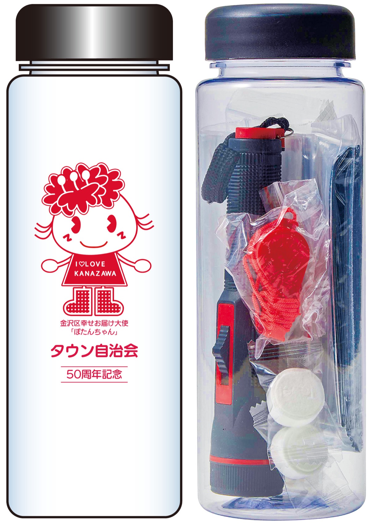 タウンニュース社では、災害に役立つものがセットになった「防災ボトル」に金沢区幸せお届け大使「ぼたんちゃん」のイラストと希望する団体名などを印刷するオリジナル品の取り扱いを始めた。