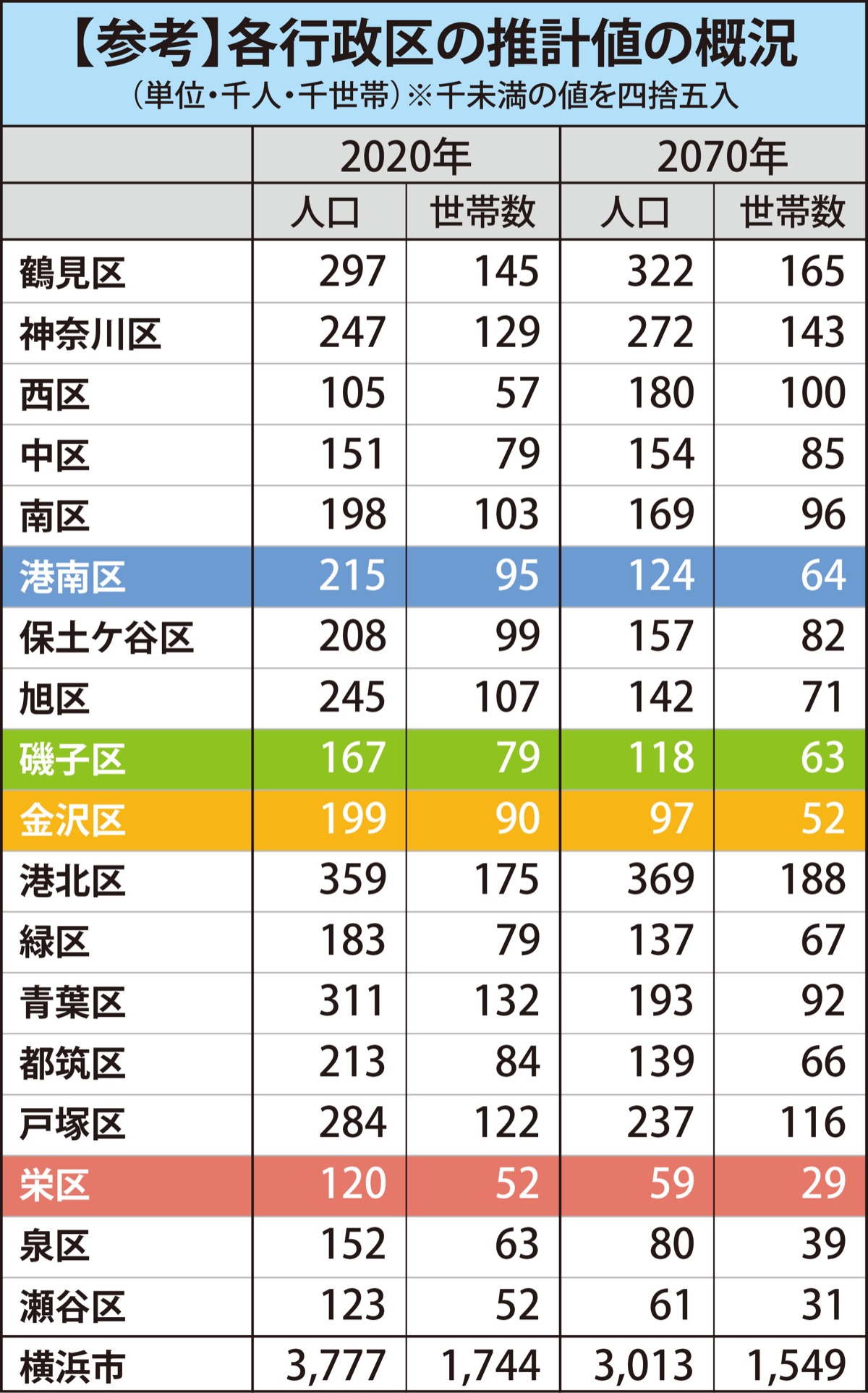 公表されたデータでは、70年の人口は港南区が12万4420人、磯子区が11万7604人、金沢区が9万7158人、栄区が5万8千659人と推計。20年の人口と比べて港南区は約4割減、磯子区は約3割減、金沢区と栄区は半減となる見通しとなった。