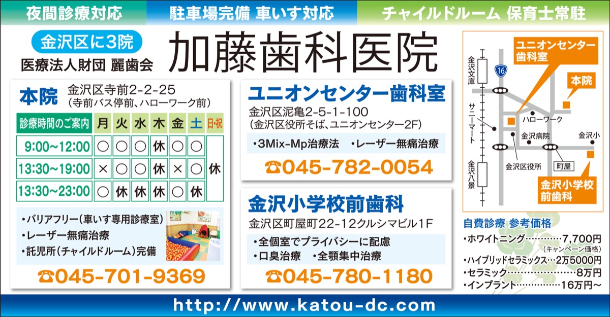 金沢区に3院ある加藤歯科医院は、保険適用で白いかぶせ物(冠)ができる「CAD/CAMハイブリッドレジン」の取り扱い医院の認定を受けている。