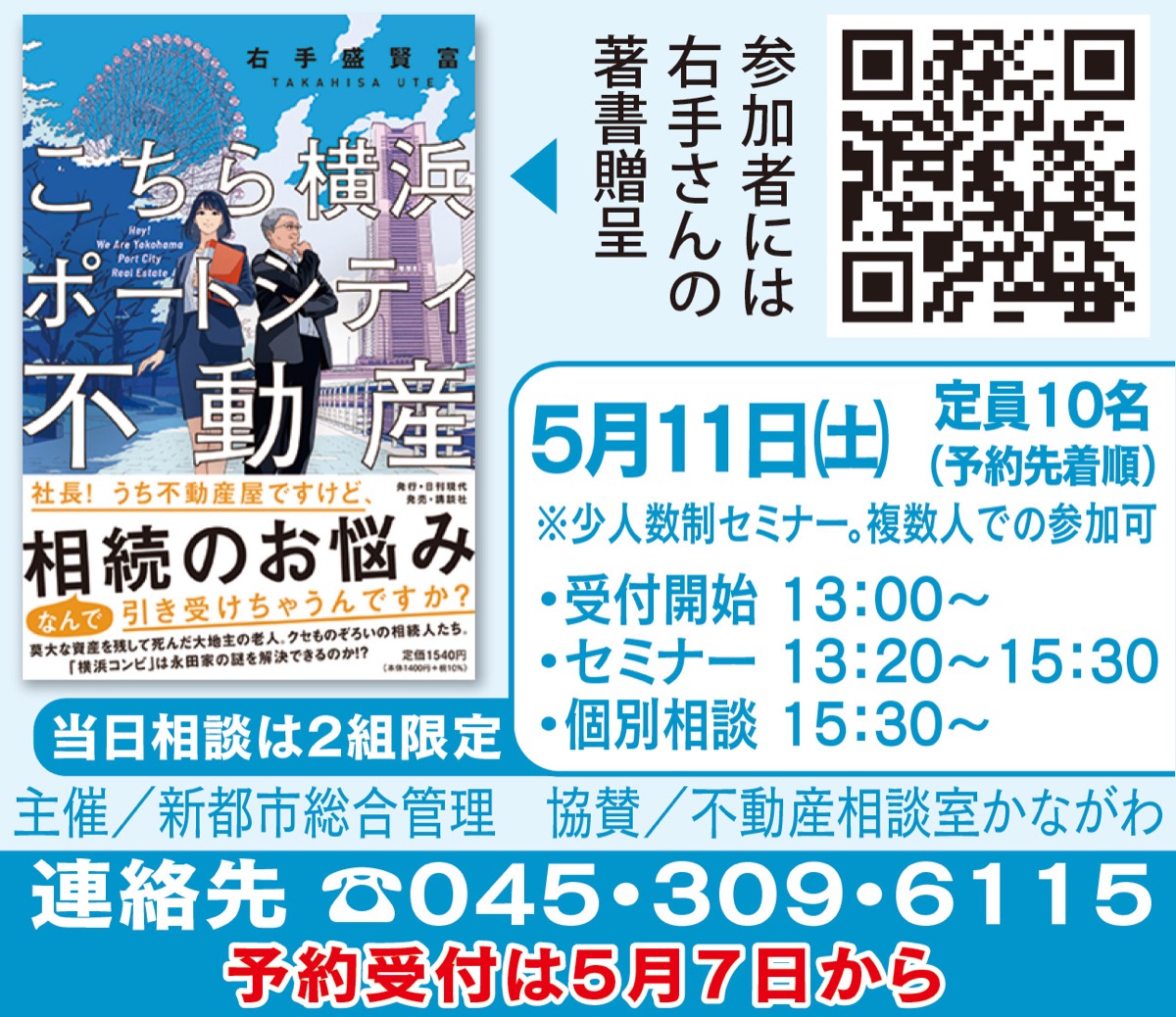 好評のセミナー「不動産オーナーの為のもめない相続対策」が5月11(土)午後1時20分から、かながわ県民センター302会議室(横浜駅西口徒歩5分)で行われる。参加無料、定員10人。個別無料相談も有(2組限定、要申込)。主催は新都市総合管理、協賛が不動産相談室かながわ。