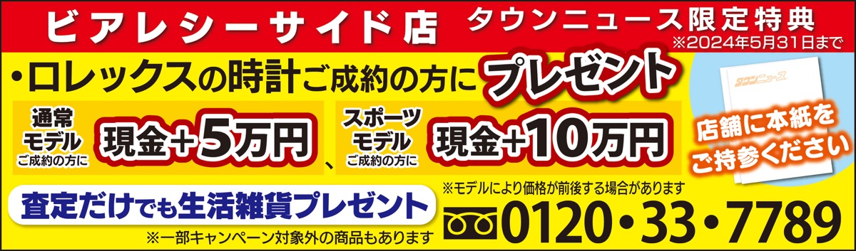 金沢区並木の商業施設「ビアレヨコハマ」本館1階にある買取専門店「おたからやビアレシーサイド店」は、5月末まで腕時計・ロレックスと金製品の買取を強化中。ロレックスはモデルに応じて買取金額にプラスして現金をプレゼントしている。スタッフは「人気のロレックスは動かなくても価値がありますので、使っていない時計があればぜひご相談ください」と話す。