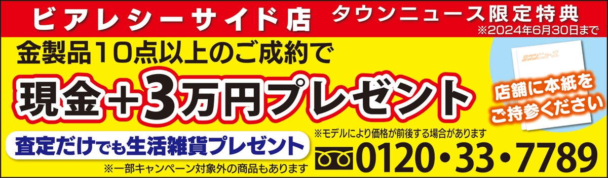 金沢区並木の商業施設「ビアレヨコハマ」本館1階にある買取専門店「おたからやビアレシーサイド店」は、6月末まで金製品の買取強化キャンペーンを行っている。