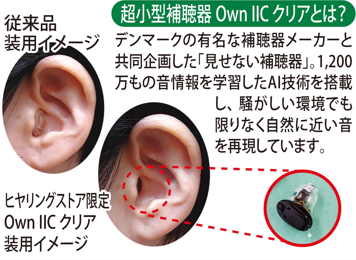 同店では「見せたくない」という装用者の思いから開発した”超小型補聴器”=写真下=を通じて聞こえを改善し、SDGsの「すべての人に健康と福祉を」をサポート。「つけていることを忘れてしまうほどの装用感」「気付かれないサイズ感」ながら雑音やハウリング音が少ないパワフルな高性能タイプで、充実の保証やアフターフォローも人気の秘訣だ。店内は完全個室対応。自宅、高齢者施設への出張も可能。