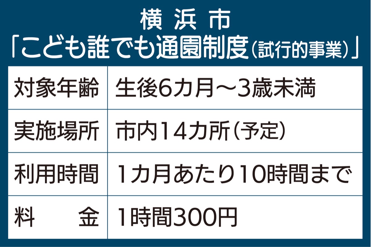 横浜市は、親が働いていなくても保育所などに子どもを預けられる「こども誰でも通園制度」の試行的事業を6月下旬から始める。21日以降に利用者の募集を順次開始。市は利用者の条件を「定期利用」に限定し、未就園児家庭の社会的孤立や育児負担軽減につなげていく。