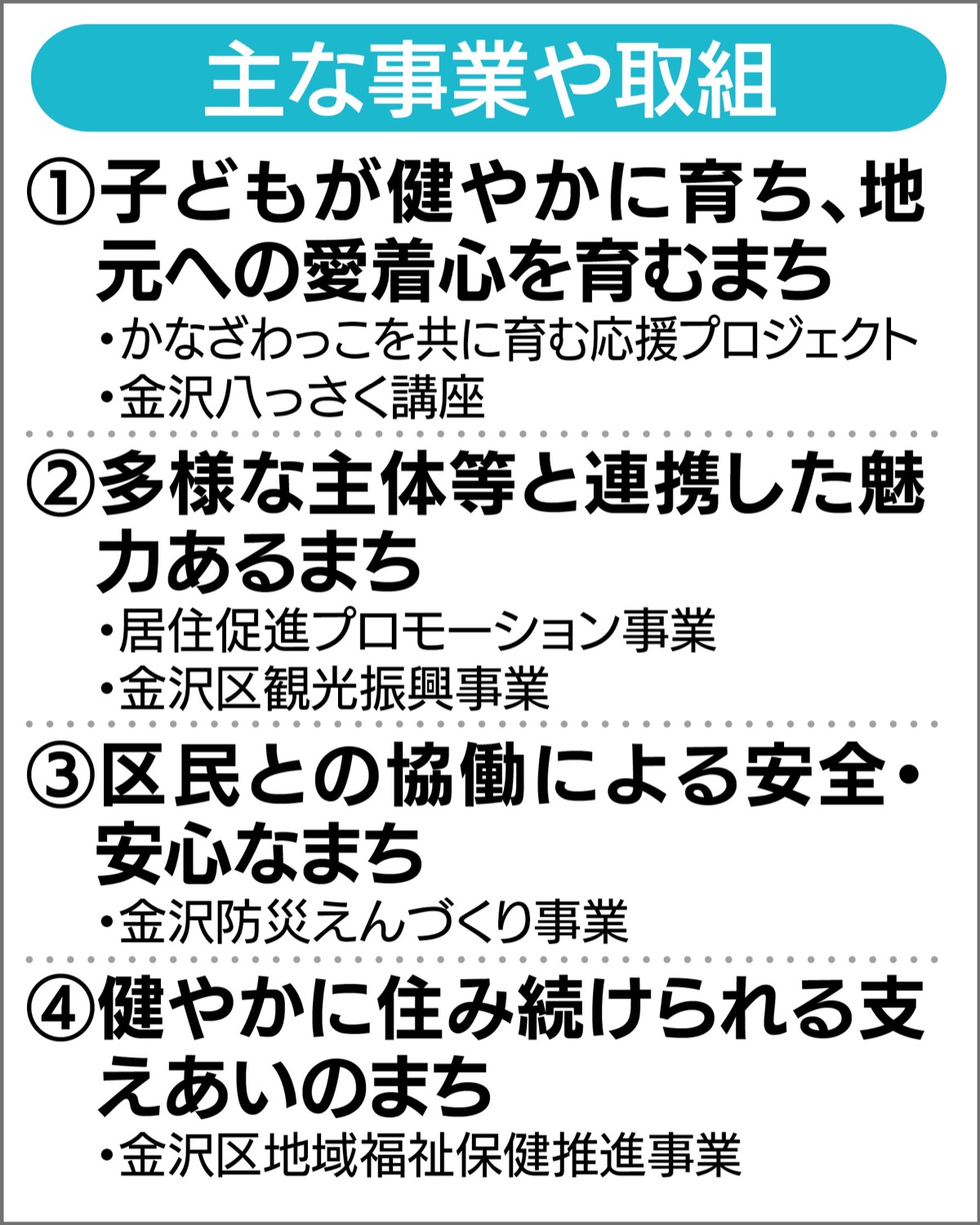 金沢区はこのほど、2024年度の区政運営に向けた目標や施策などを定める「運営方針」を公表した。基本目標は「地域の皆様と共に考える、挑戦する、つくる!〜訪れたい、住みたい、住み続けたいまち 金沢を目指して」。目標達成に向けた施策には「子ども・子育て」「まちの魅力づくり」「暮らしの安全・安心」「福祉保健の推進」の4つを掲げた。