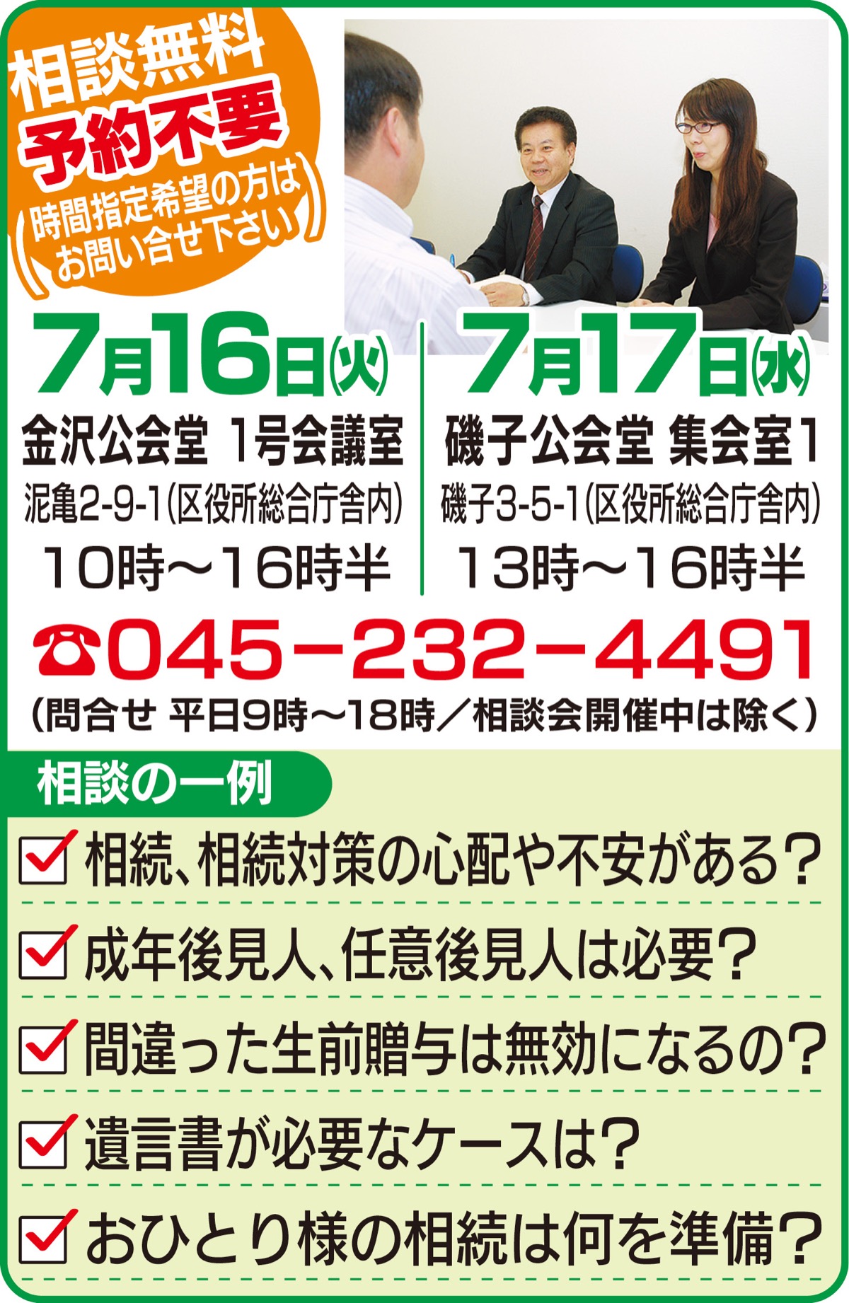 行政書士や社団法人代表など相続の専門家による遺言書、後見人、相続対策、贈与、不動産など相続全般に関わる無料個別相談会が開催される。横浜市民 相続 遺言 贈与相談センターの主催。