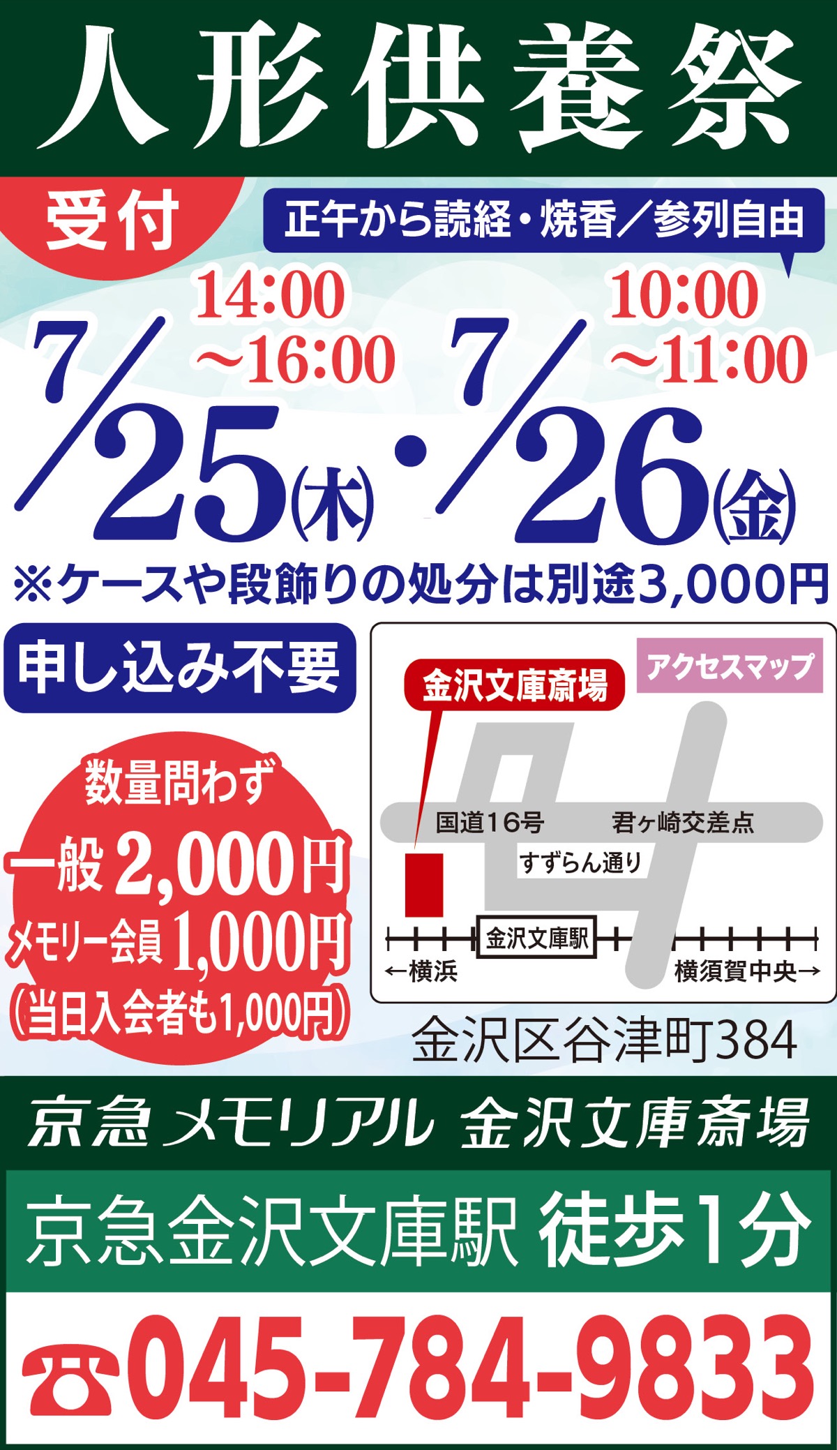 持ち込みは申し込み不要で、7月25日(木)午後2時〜4時、26日(金)午前10時〜11時の2日間。26日正午から読経・焼香を執り行う(参列自由)。料金は数量問わず一般2千円、メモリー会員1千円(カード提示/当日入会者も割引)。ガラスやアクリルケース、段飾りなどの処分は別途3千円。「入会申し込みは随時受付中で会員カードの再発行も可能です」と同社。