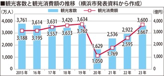 横浜市は、2023年の市内の観光客数が前年比23・2%増の3600万人、観光消費額が3667億円(同41・3%増)と推計する結果を発表した。客数、消費額ともにコロナ禍前の2019年と同水準で、観光の回復が鮮明となった。