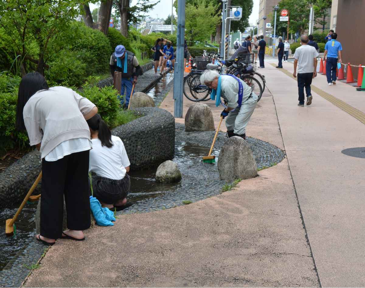 また、今年は初めて横浜磯子ロータリークラブ、ヤオコー横浜磯子店、(株)浜田不動産も飲料や休憩場所の提供などを通して活動に協力。遊歩道を管理する磯子土木事務所の職員や八谷将人副区長らも加わり、生徒らと一緒にデッキブラシやトング、網などを使って遊歩道沿いを流れるせせらぎを中心にきれいにしていった。