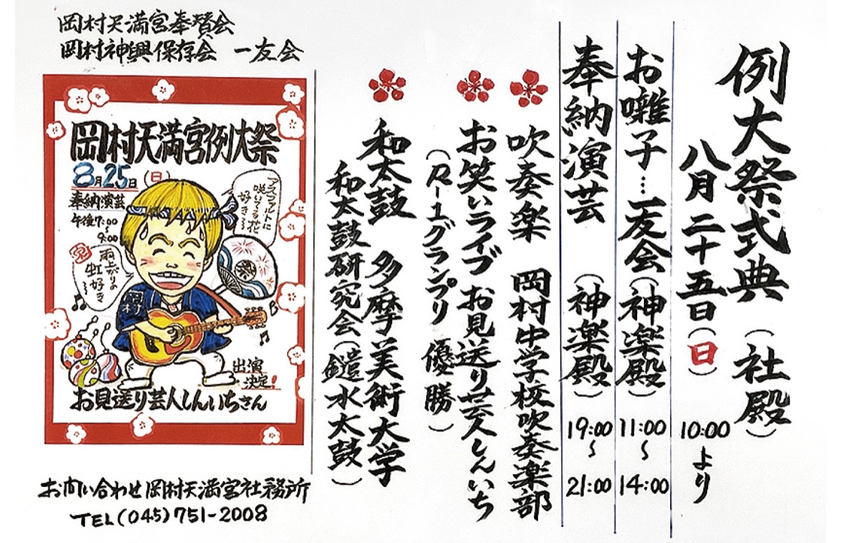 25日の午後7時から神楽殿で行われる奉納演芸では、同区岡村出身のアーティスト「ゆず」の大ファンで、R―1グランプリ元チャンピオンの「お見送り芸人しんいち」さんがお笑いライブを行う。