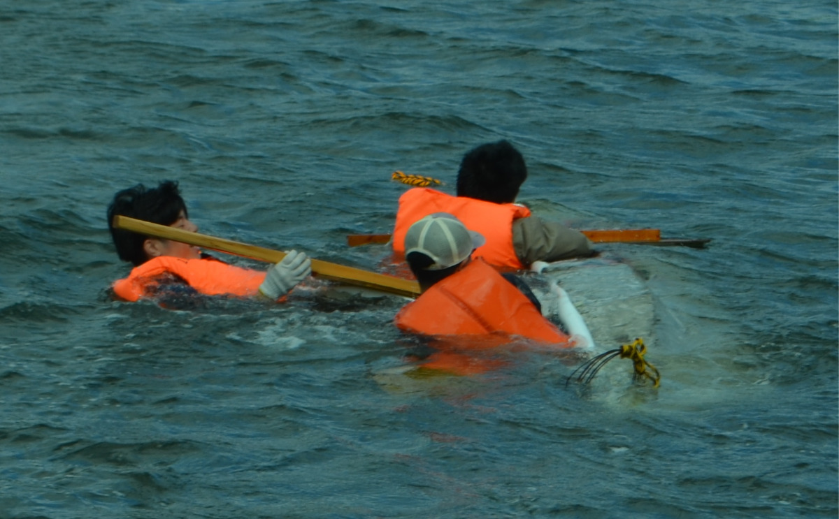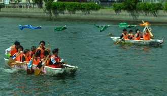 コンクリートとダンボールでできた全6艇の手作りカヌーが、侍従川往復300mのレースで競い合った。3艇ずつ2回のレースを午前と午後にそれぞれ行い、2回のレースの合計タイムが1番早いチームが勝利するルールで、今年は2年生のチーム「一蓮托生」号が優勝した。