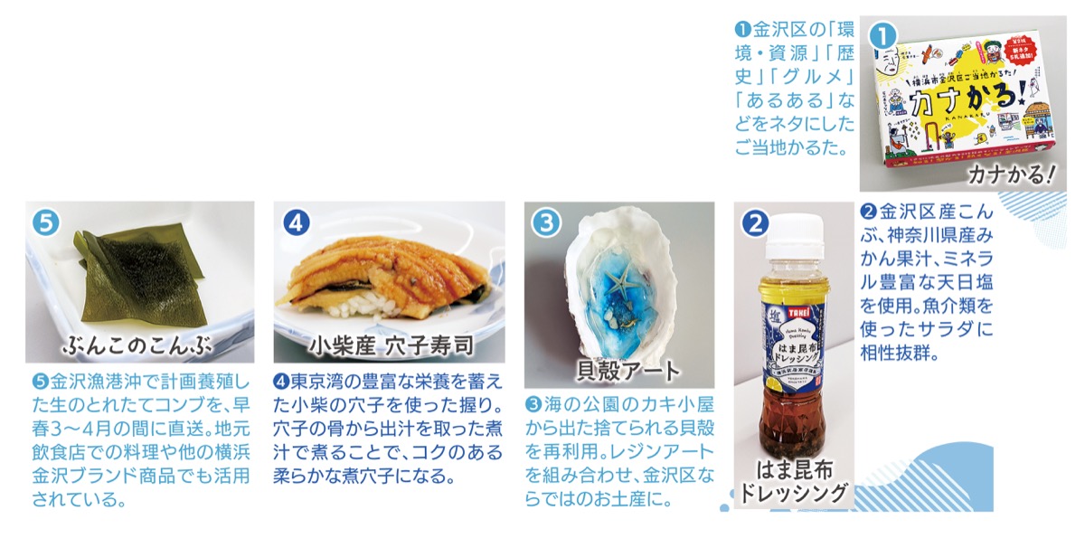 認定された商品は以下▽横浜市金沢区ご当地かるた「カナかる!」(第2版)/「カナかる」企画・運営チーム▽はま昆布ドレッシング/(株)武居商店▽貝殻アート/(株)ミナロ▽小柴産 穴子寿司/山喜鮨▽ぶんこのこんぶ〜浜揚げコンブin金沢漁港/幸海ヒーローズ(サトーシステムエンジニアリング(株))
