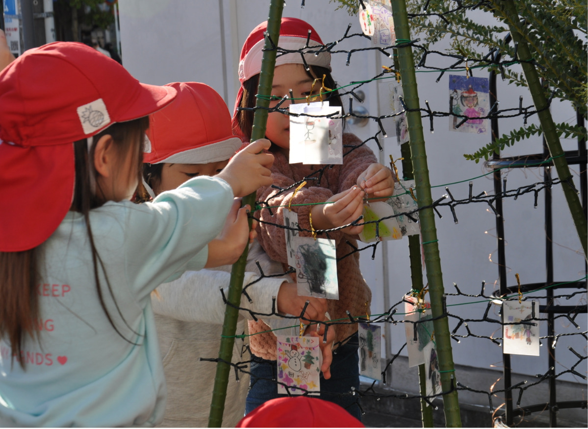 今年は初めてツリー型のイルミネーションも用意した。支柱作ったツリーへの飾りつけには、同会の川村慧さんと鈴木誠一さんに加え、アイン能見台駅前保育園とYMCAマナ保育園から8人ずつ参加。園児たちがサンタクロースやトナカイなどを描いたプラ板や金色に光る電飾などを飾り付けていった。飾りは今後も増える予定で、最終的には62枚のプラ板が飾られるという。