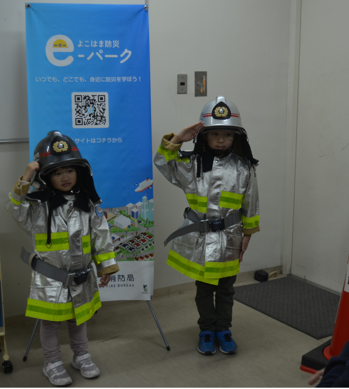 子どもたちは読み聞かせの後、消防服を着用した。「消防士になりたい」と話す区内在住の田代輝向さん(6)は消防服を着用し、真剣なまなざしで敬礼のポーズをしていた。