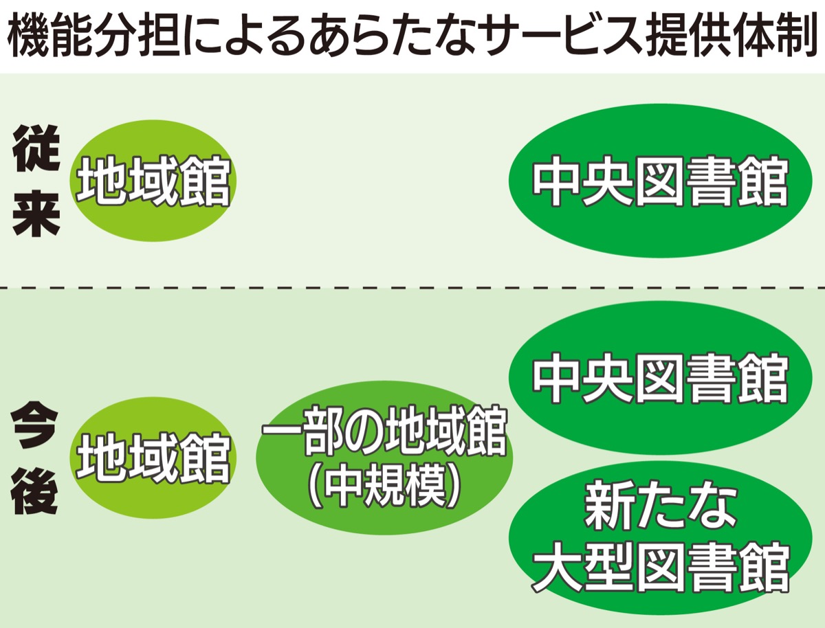 また、図書館以外の商業施設や地区センターなどで図書の受け取りや返却ができる「図書取次拠点」を増やすことも検討し、大型図書館が中心的な役割を果たす。